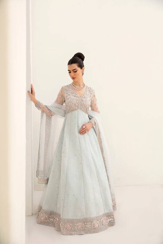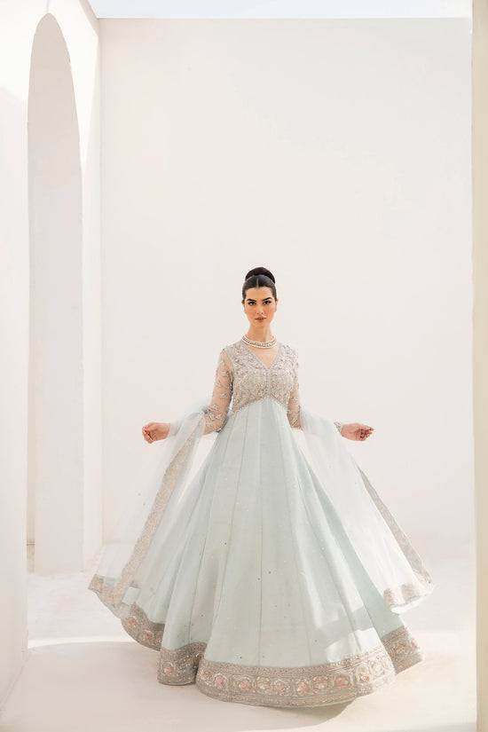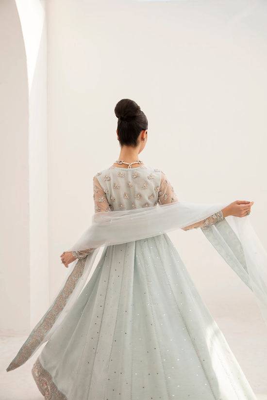 This enchanting ice-blue pishwas is heavily embellished with 3D silver adda work on the bodice and sleeves in a mesmerizing pattern. The flare of pishwas is crafted from fine raw silk fabric and is adorned with a delicate spray, creating a captivating silhouette. To complete the look, it comes with organza dupatta having embroidered borders and spray all over, adding the perfect finishing to this creation.
