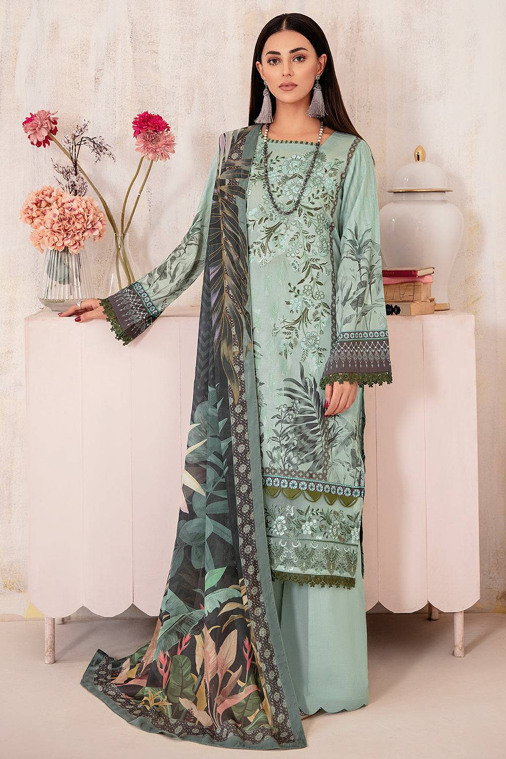 This Ramsha Rangrez Lawn ensemble in Sage Green offers a perfect blend of comfort and style for summer days. Featuring an embroidered digital printed lawn shirt with a coordinating embroidered patch for the daman, paired with a digital printed silk dupatta and dyed lawn trouser, this outfit is ideal for casual occasions while maintaining a stylish and elegant look.