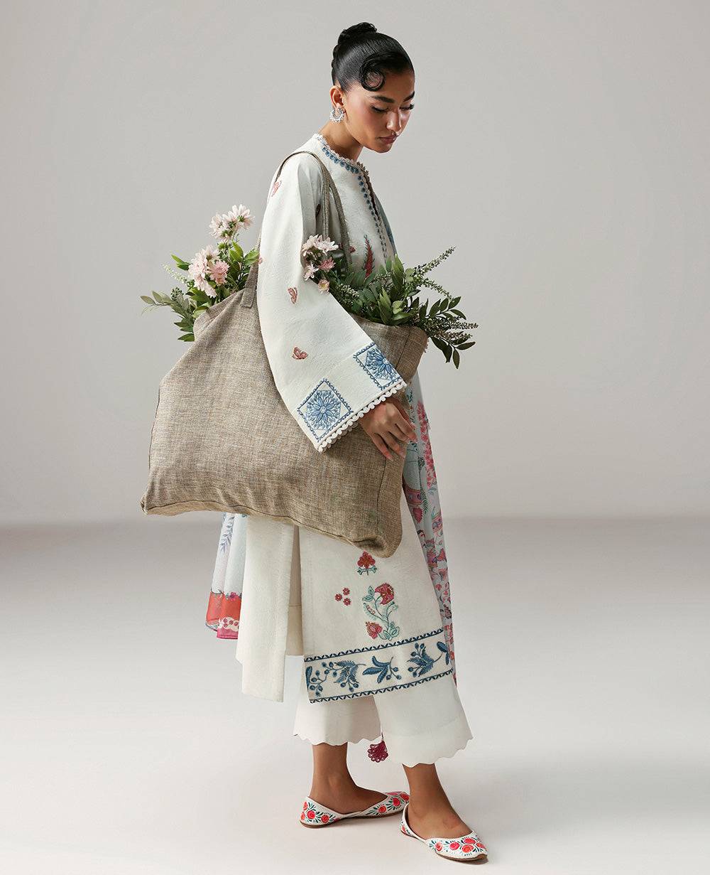 Gracefully rooted in tradition, this Mughal-inspired long shirt is adorned with intricate suzani embroidery, reflecting timeless craftsmanship. The look is elevated with a printed karandi net dupatta, adding richness and contrast. Scalloped hem trousers complete the ensemble with refined detailing, offering a seamless blend of heritage and contemporary elegance.