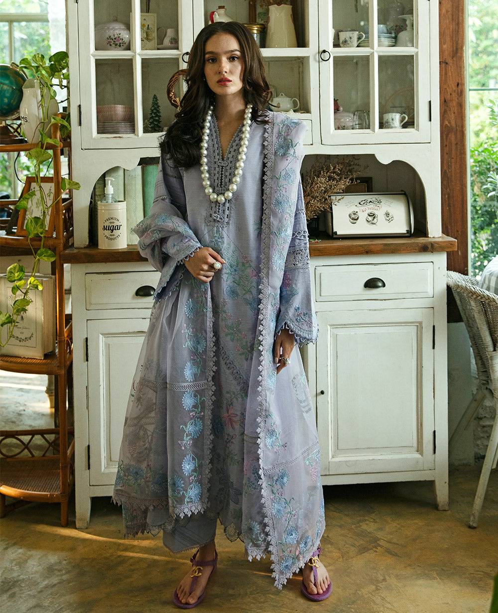 Eugine is a serene ensemble in a delicate periwinkle hue, featuring a slub lawn shirt with refined embroidery. Tailored with scalloped stitching and adorned with dyed laces for a graceful touch, it exudes elegance and simplicity. The organza embroidered dupatta, detailed with lace along its edges, completes this delicate and sophisticated look, ideal for festive or semi-formal occasions.