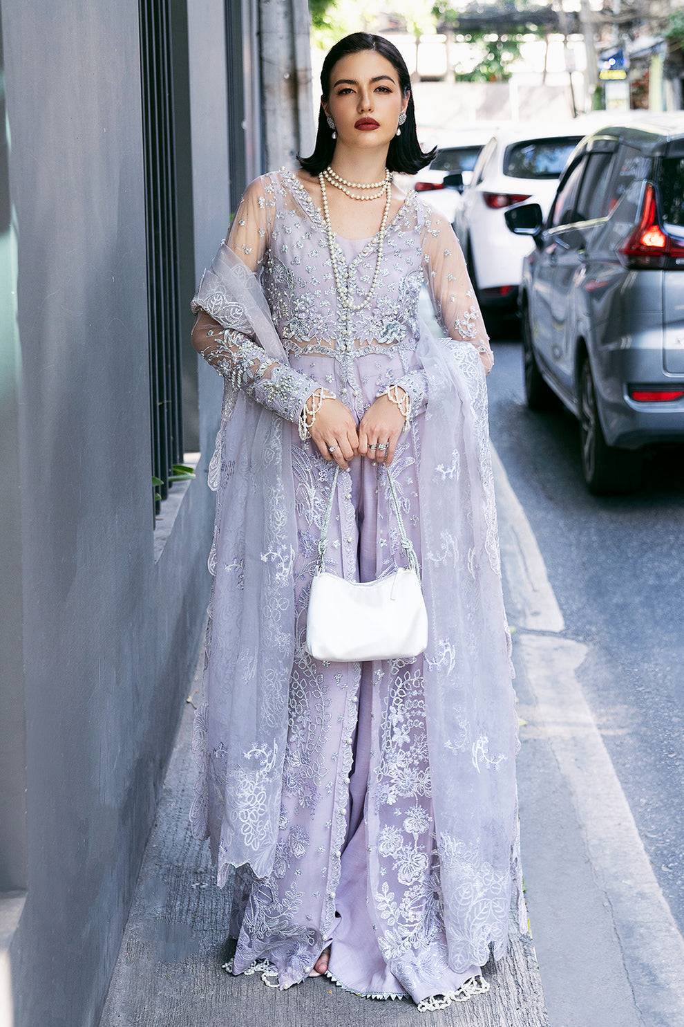 This elegant light purple ensemble from Saad Shaikh’s Fleurie Vol 2 is a luxurious display of craftsmanship. Featuring a hand-embellished bodice with embroidered front and back panels, the outfit captures refined beauty. The delicately adorned net sleeves with raw silk borders complement the design, while the embroidered organza dupatta with detailed pallus adds sophistication. Completed with raw silk trousers and undershirt, this outfit blends traditional artistry with modern sophistication, making it perfect for weddings and formal celebrations.
