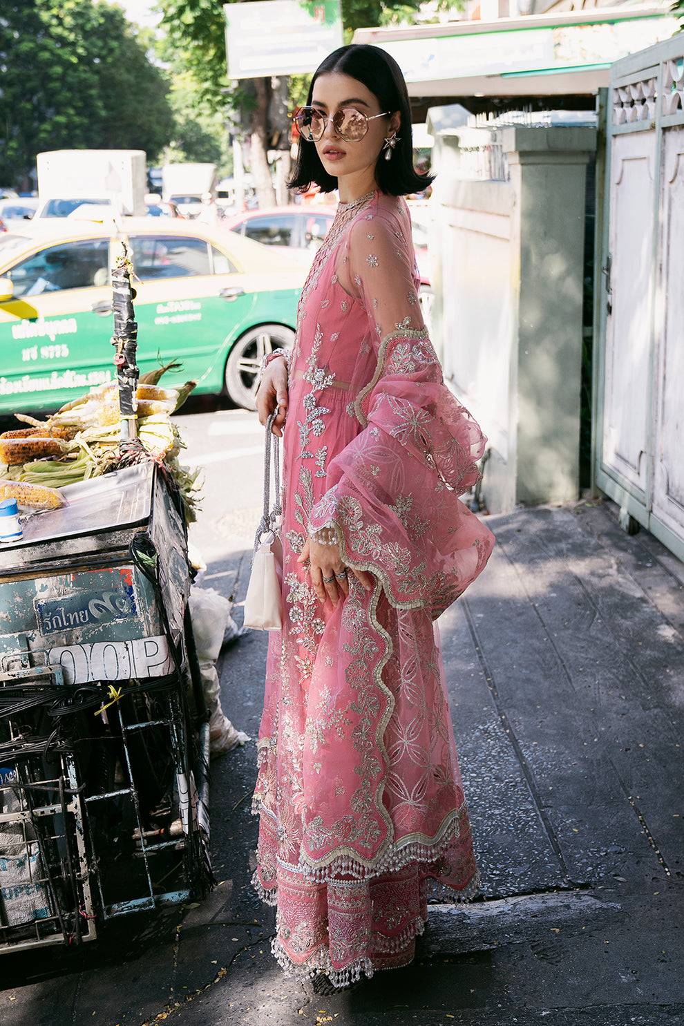 This Saad Shaikh Fleurie Vol 2 ensemble in rose pink radiates refined elegance, perfect for formal occasions and weddings. Crafted on delicate net with hand-embellished panels and embroidered borders, the outfit highlights meticulous craftsmanship. The organza neckline adds a graceful touch, while the heavily worked sleeves and embroidered organza dupatta with decorative pallus elevate the look. Completed with raw silk trousers and undershirt featuring organza borders, this piece blends traditional charm with modern luxury.