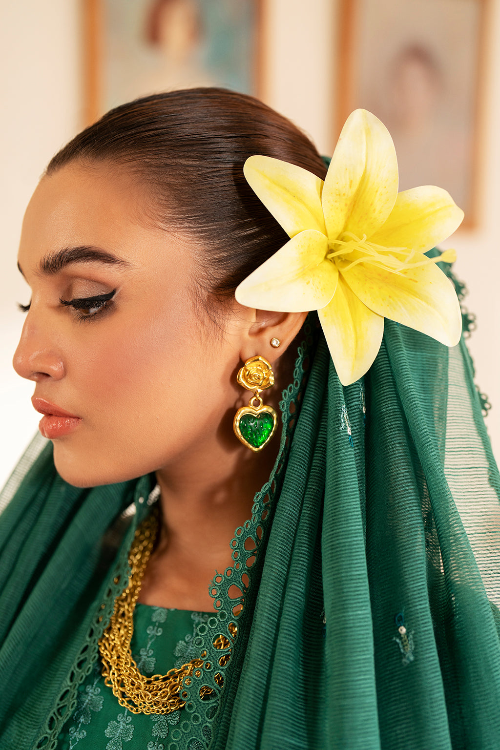 This green ensemble from Saad Shaikh’s Lumiere Collection is a refined blend of elegance and texture. The dull silk shirt features an embroidered center panel, left and right panels, and sleeves, paired with a dyed back and a delicately embroidered front border. The dupatta combines khadi net with organza pallu and border detailing, creating a layered, luxurious effect. A dyed dull silk trouser completes the look, making this outfit a graceful choice for festive occasions and formal gatherings.