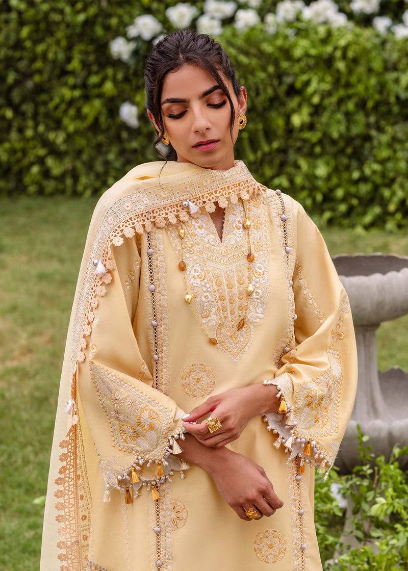 Embroidered lawn Front Panel (Center)-1 piece Embroidered lawn Side Panel (Right)-1 piece Embroidered lawn Side Panel (Left)-1 piece Embroidered lawn Sleeves-0.66 meter Embroidered organza shirt border-2 meter Embroidered organza corner patches-4 pieces Embroidered organza trouser border-1 meter Lawn Back-1 meter Khaddi net embroidered dupatta-2.33 meter Khaddi net embroidered dupatta pallu-2 pieces Cambric Trouser-2 meter "Zaphira - Sweet and charming like a fairytale princess. Tonal embroidery on soft summer base colors with a subtle texture play of gara and fine embroidery techniques. This look is enhanced with an organza karandi dupatta framed in chikankari inspired embroidery details. Dont miss the delicate color contrast pops here and there. " Disclaimer: This is an unstitched article. Stitching facility is not provided. Tassels, laces and buttons are not included in the article. Product color may slightly vary due to photographic lighting sources or your monitor setting.