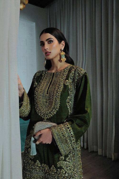 Drawing inspiration from Sindh’s architectural heritage, this Mehndi Green kurta by Saira Rizwan from the Riona Luxury Formals collection is crafted from pure raw silk. The ensemble is adorned with naqshi dabka and gota work, delicately finished with intricate gotta scallop detailing along the edges. Paired with raw silk culottes, this outfit strikes the perfect balance of traditional artistry and contemporary sophistication, making it a timeless choice for festive and wedding occasions.