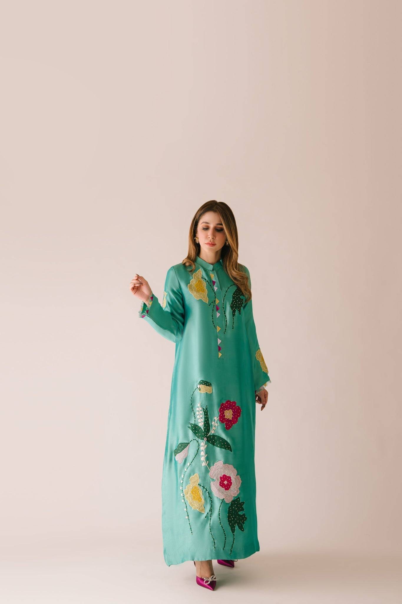 Pure aqua green long shirt with organza applique and embroidery work all over the front and sleeves. Subtle sequins spray all over the shirt. Multicolor organza detailing on the neckline and sleeves.