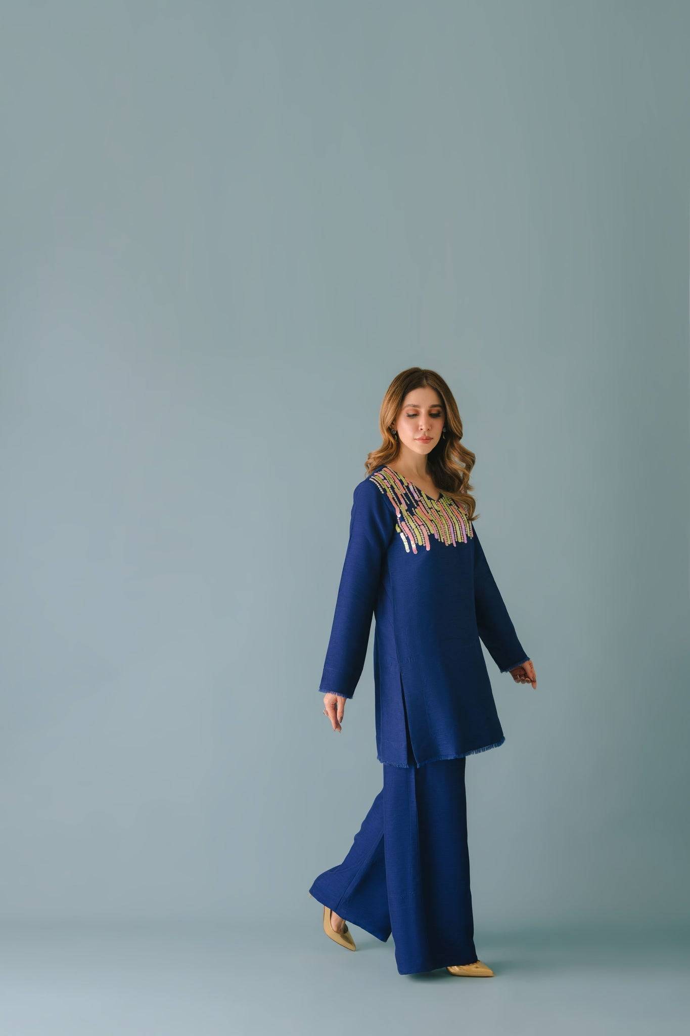 Pure Korean rawsilk shirt with hand embellishments of coin sequins and rhinestones on neckline. Paired with pure Korean rawsilk boot cut pants