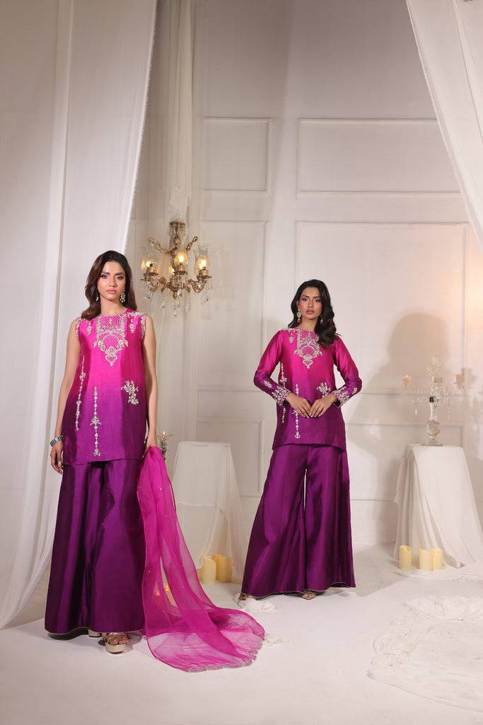 A gorgeous ombre pure sheesha silk short shirt with super intricate hand embellishments on neckline, front and sleeves. Gota, kora, dabka, rhinestones and sequins. Paired with pure sheesha silk peplum pants. Dupatta is pure medium organza with hand embellished paloo on both the sides. Rhinestones spray all over.