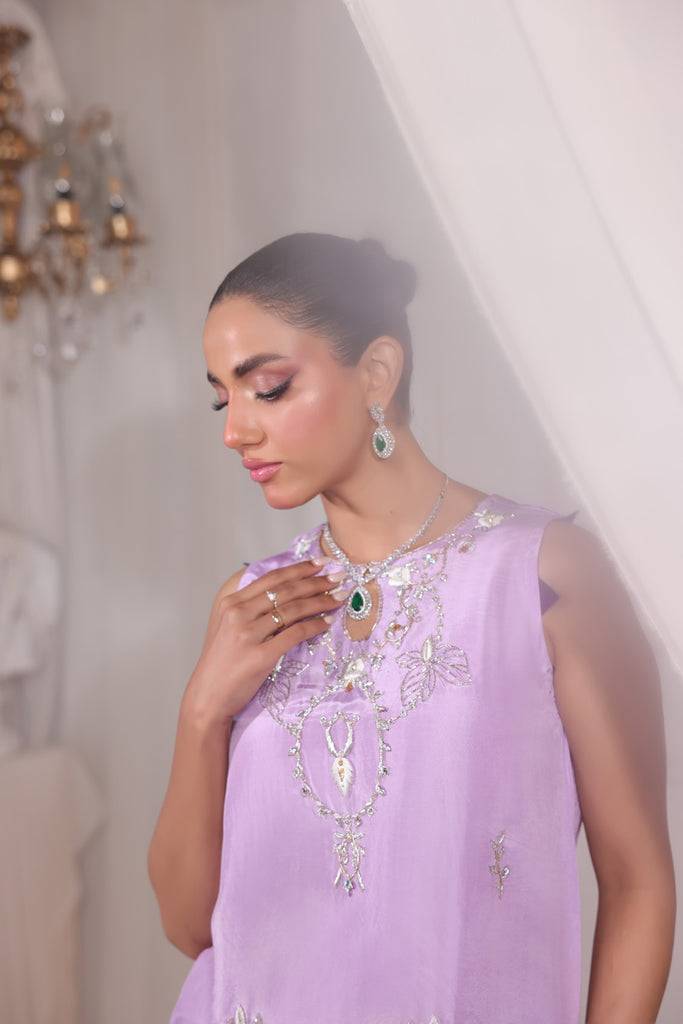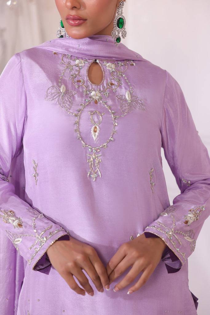 A pure tassel silk lavender short shirt with gorgeous embellishments on neckline, sleeves and front. Kora, dabka, reshamwork, rhinestones and sequins work. Finished with purple organza detailing on daaman and sleeves. Paired with a pure tassel silk khuli shalwar. Dupatta is pure medium silk with sequins spray all over and finished with purple organza tassels on both sides.