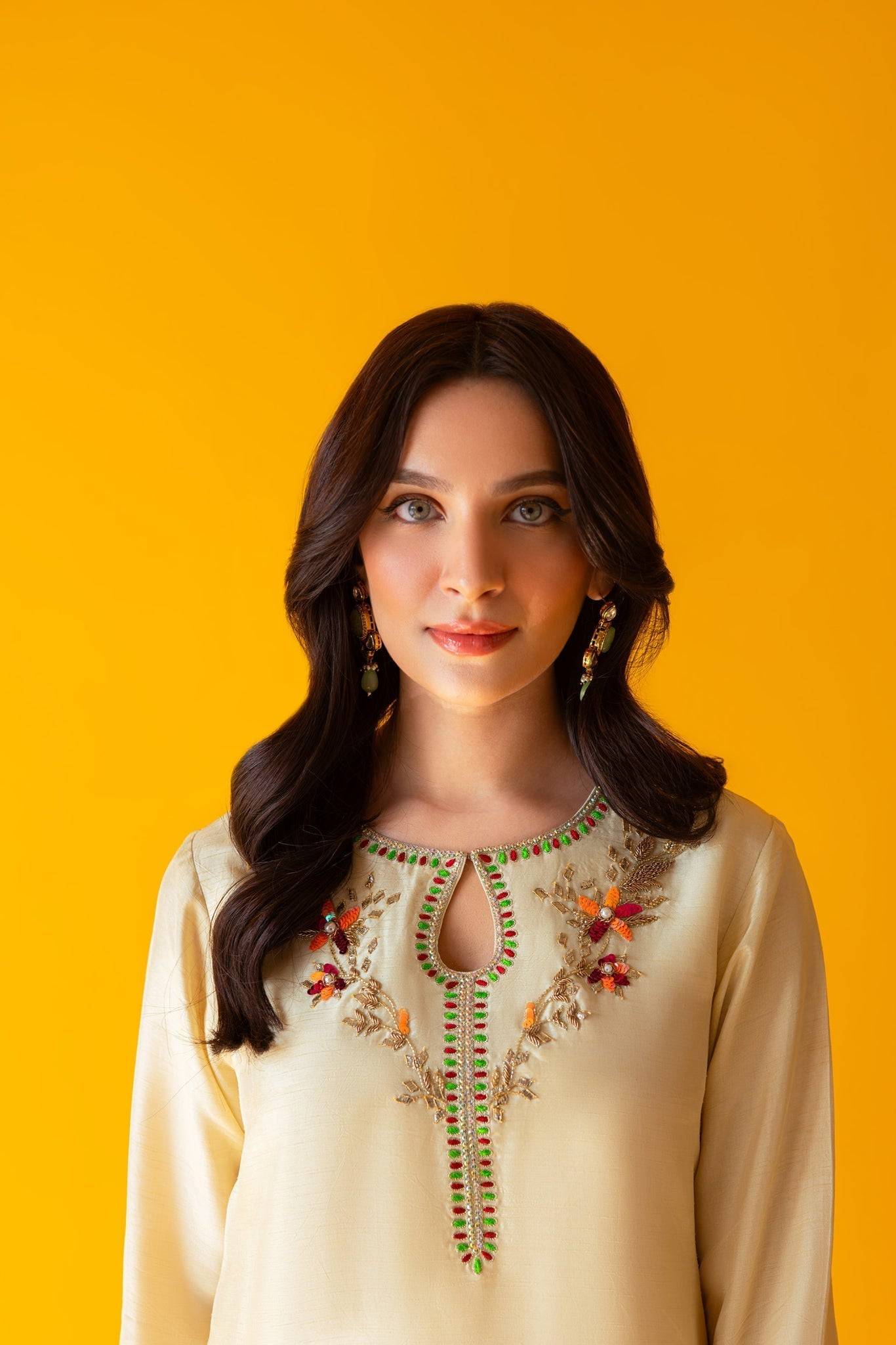 A pure Korean silk cream short shirt with hand embellishments on neckline. Sequins, rhinestones, pearls, kora dabka and cut daana mixed with hand ari resham work. Paired with Korean silk shalwar.