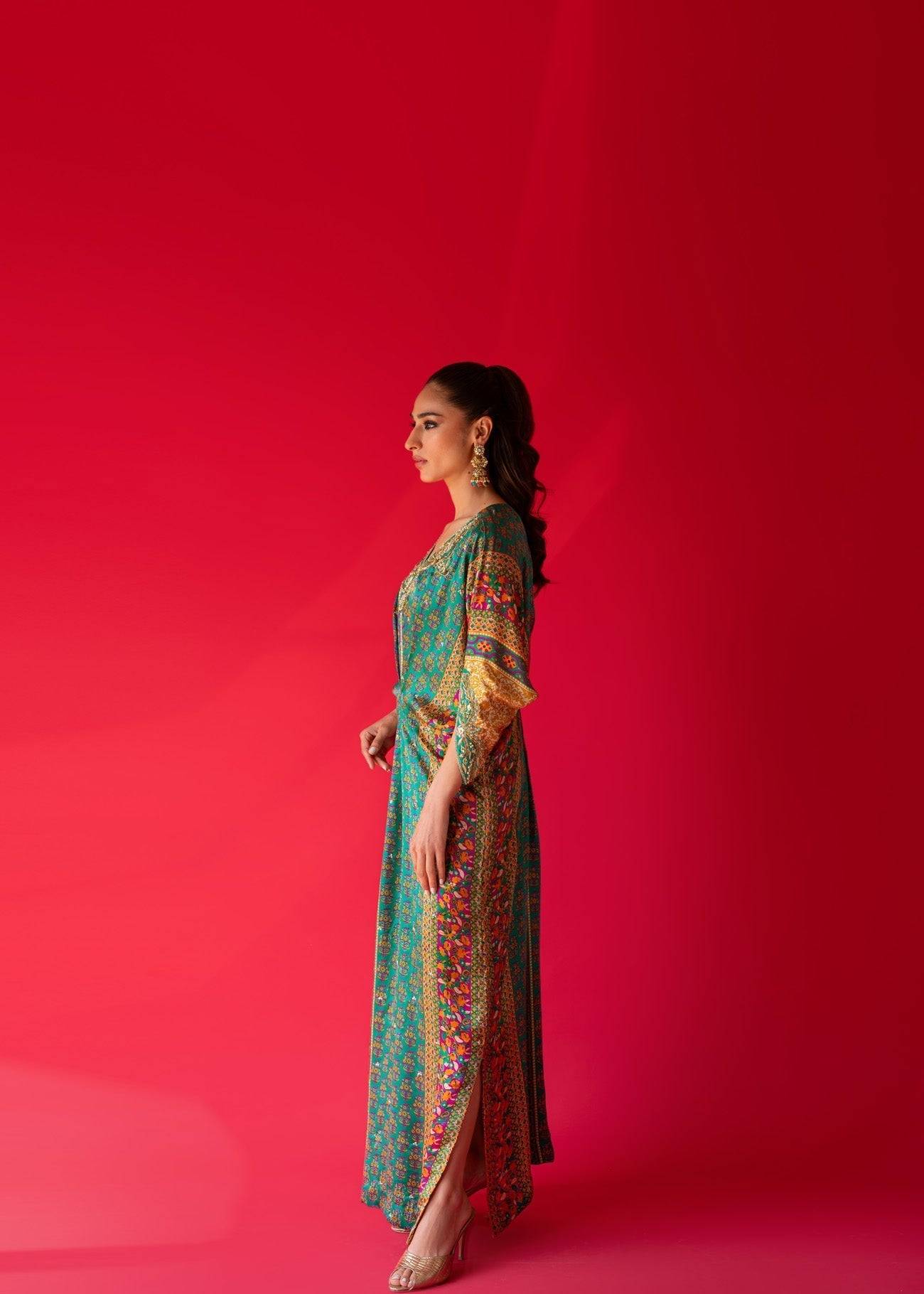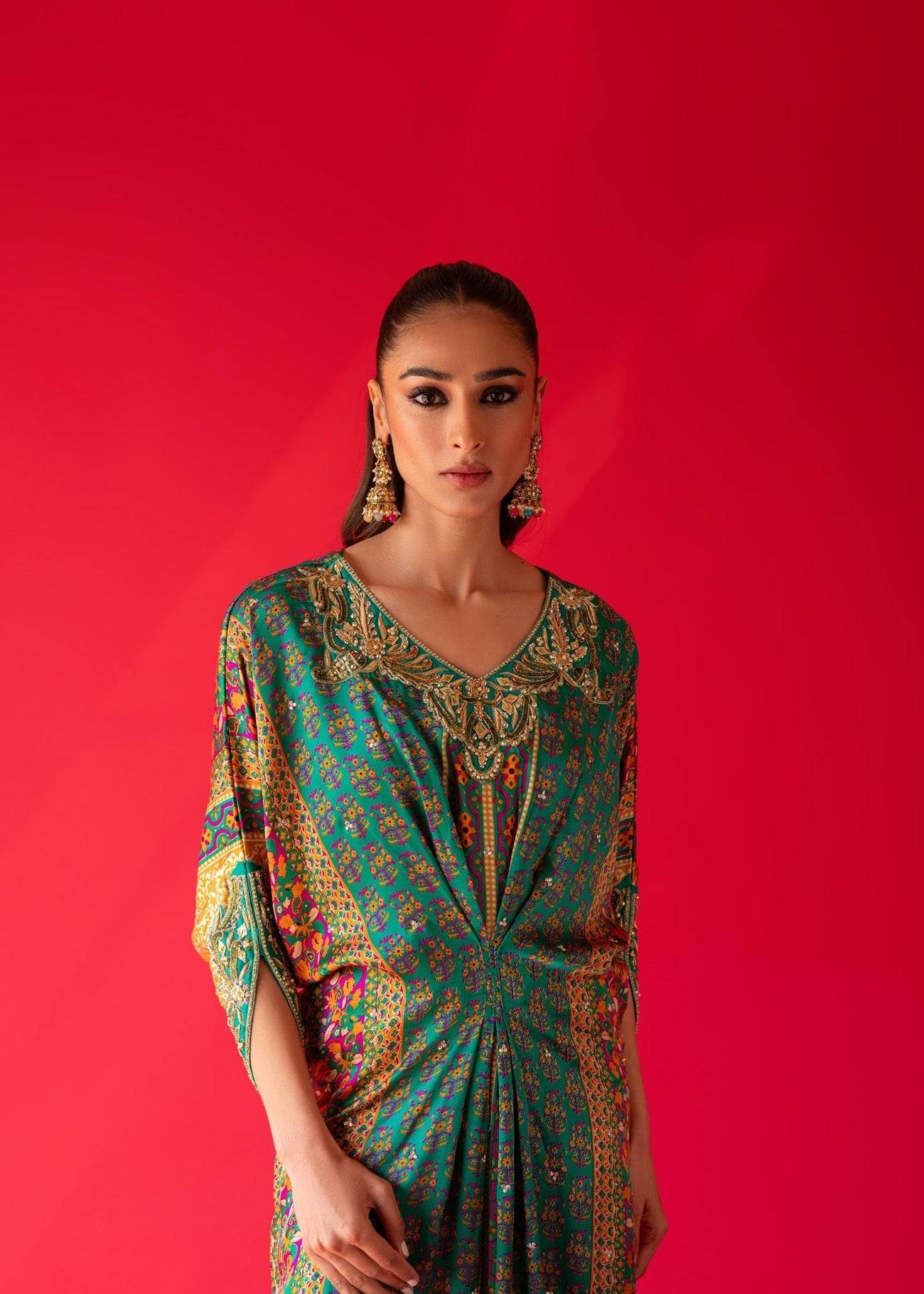 A pure charmeuse silk screenprinted caftan with an appliquéd and hand embellished neckline and sleeves.