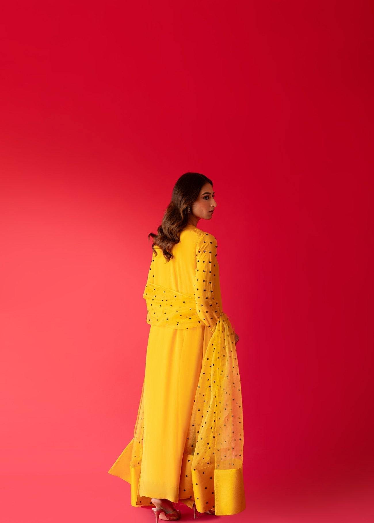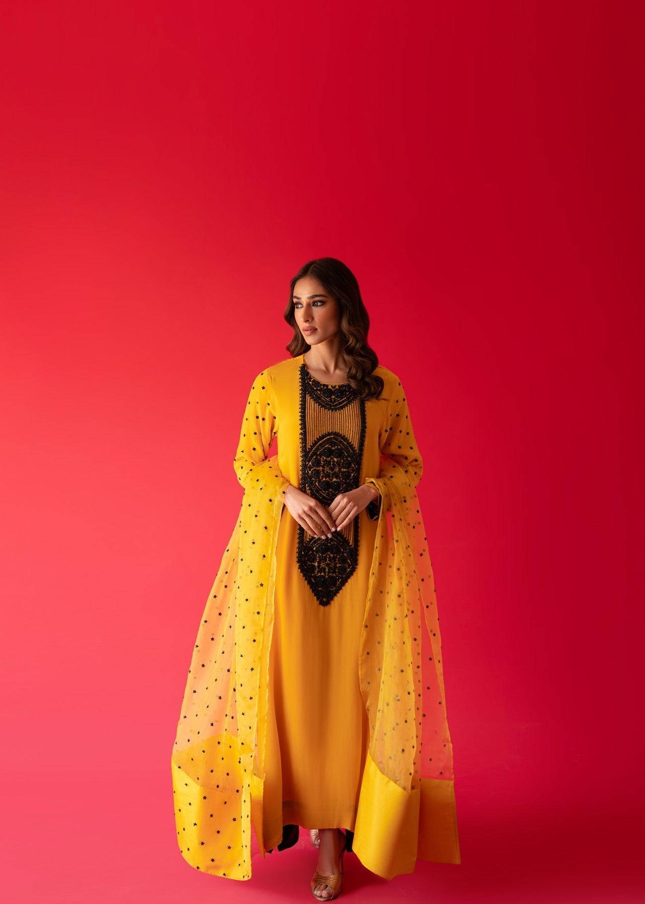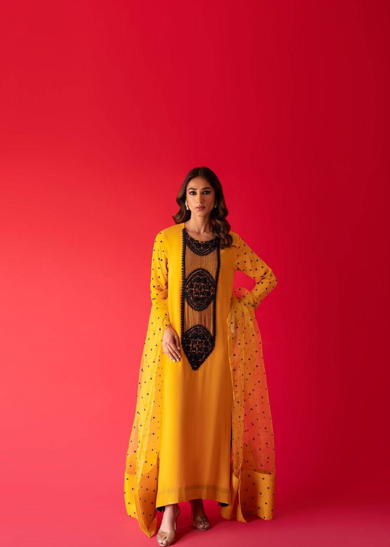 Mustard yellow pure grip silk 60 gms long maxi style shirt fully hand embellished with crystals, beads, sequins, cut daana and kora dabka. Paired with pure grip silk 60 gms capri pants.