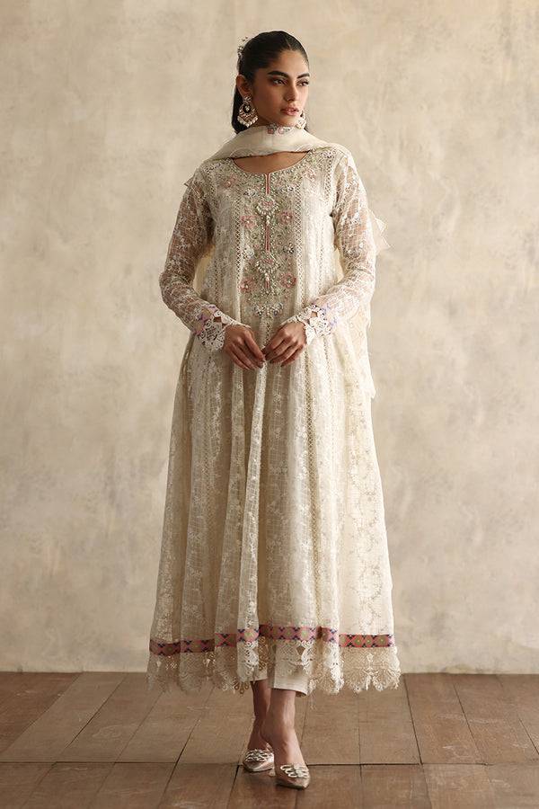 This exquisite kalidaar pishwaas in a pristine ivory shade radiates timeless elegance, featuring a gorgeous embroidered neckline with handcrafted motifs. The sleeves and hemline are beautifully edged with printed borders, adding a touch of refinement.