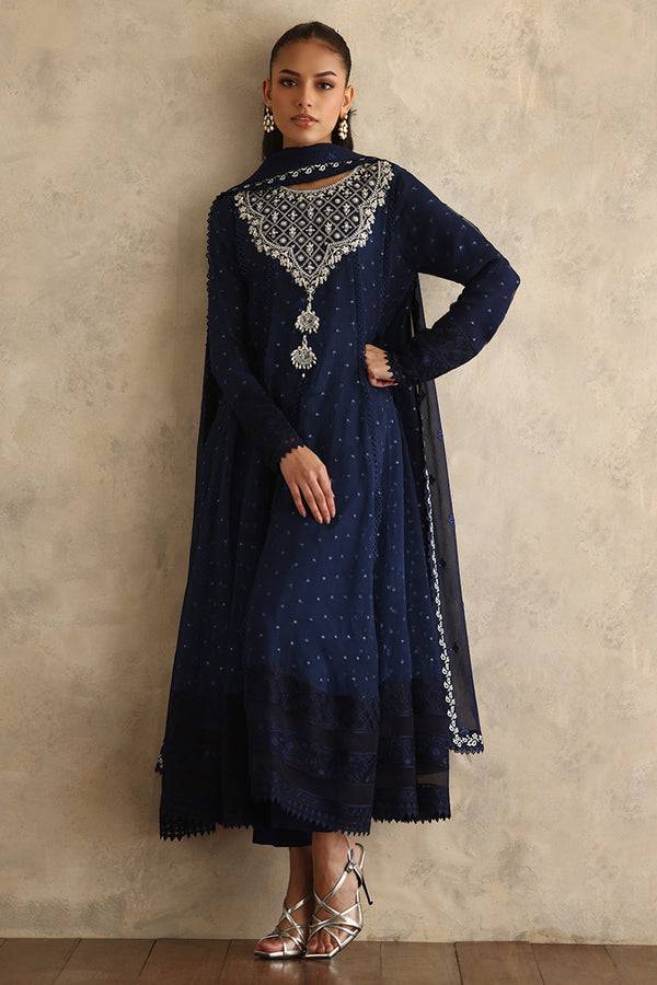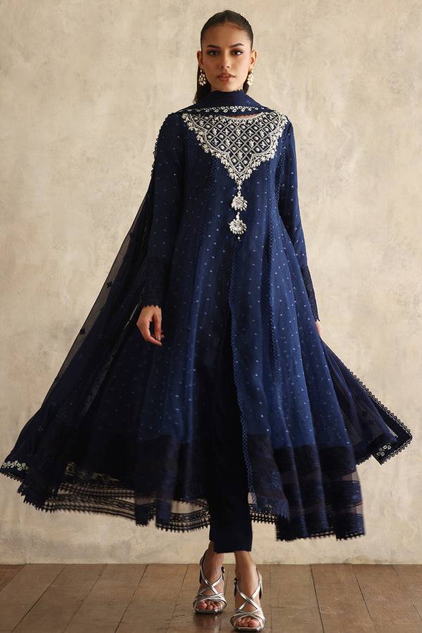 An elegant front-open navy blue pishwas in embroidered organza. The beautiful embroidered neckline adorned with handcrafted motifs and delicately edged with organza borders adds a luxurious touch to its refined design.