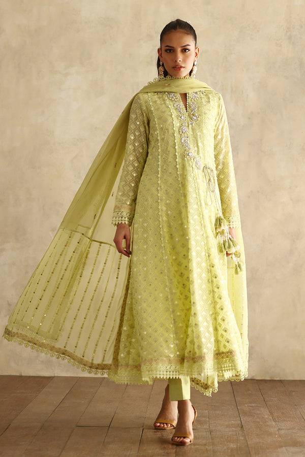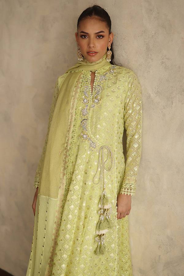 This gorgeous angharka cut in flowy embroidered chiffon comes in a refreshing shade of lime green. The exquisite embroidery and handcrafted tassels add a delicate touch of elegance.