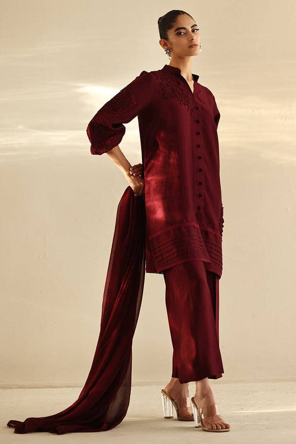 This burgundy cotton silk shirt screams elegance with 3D floral details on front, neckline and sleeves. Paired with matching cotton silk culottes and a chiffon dupatta with lace edgings.