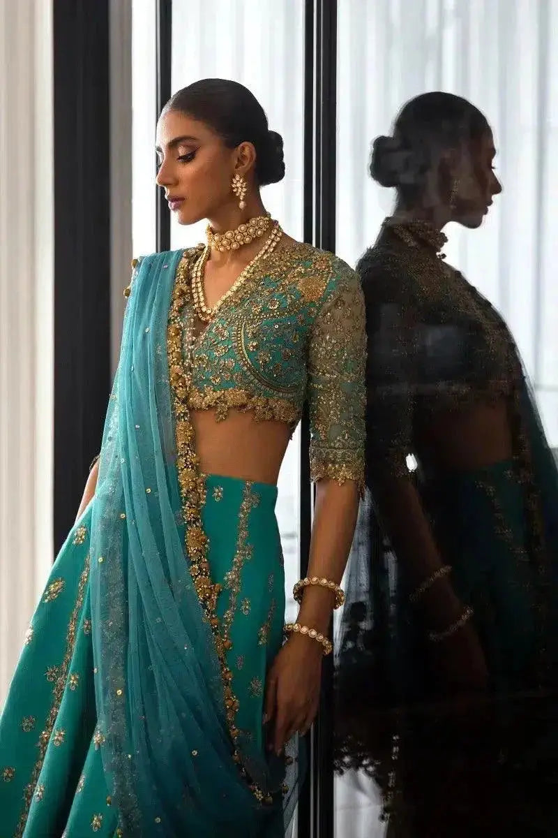 Lehnga Embroidered Sea Green Raw Silk | 5 Meters |