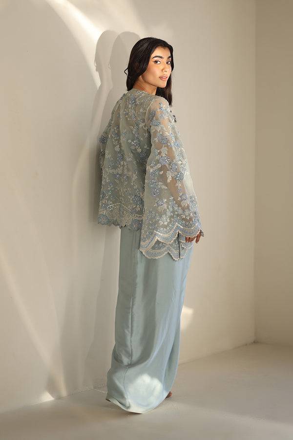 Exuding celestial elegance, this ice-blue ensemble pairs a structured charmeuse tube top with a diaphanous, fully embroidered organza jacket. Rendered in a whispering frost hue, the jacket is adorned with intricate zardoze work, delicate scalloped edges, and luminous floral embellishments. Paired with a matching pre-draped waterfall skirt, crafted from lustrous charmeuse, creating a seamless blend of structure and fluidity.