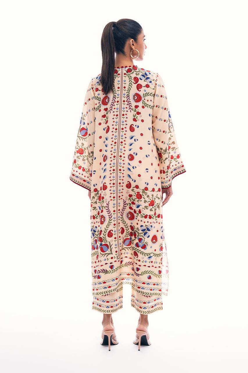 A long tunic cut from cream Colored crepe is artfully rendered with a playful print featuring vibrant tones and fabric manipulated details and paired with printed culottes.