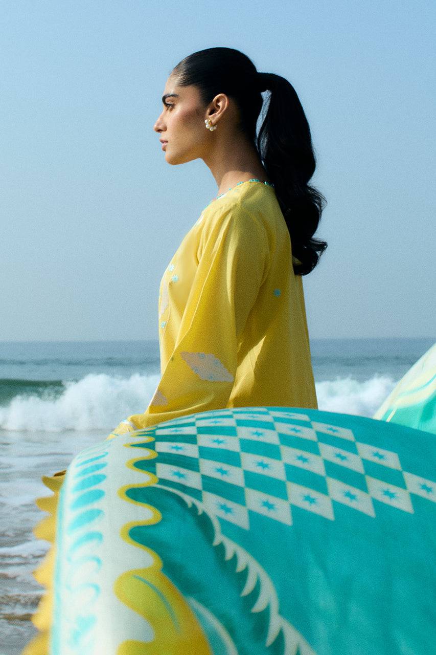 An elegant mix of resham and applique embroidery adorns a lemon yellow hued jacquard lawn shirt and culottes. A floral bouquet in the most subtle hues of ivory and moss green is embellished on the hem with checkered mint applique elevating the sleeves. Paired with a frosty mint pure medium silk dupatta featuring an ethereal print in shades of pastel.