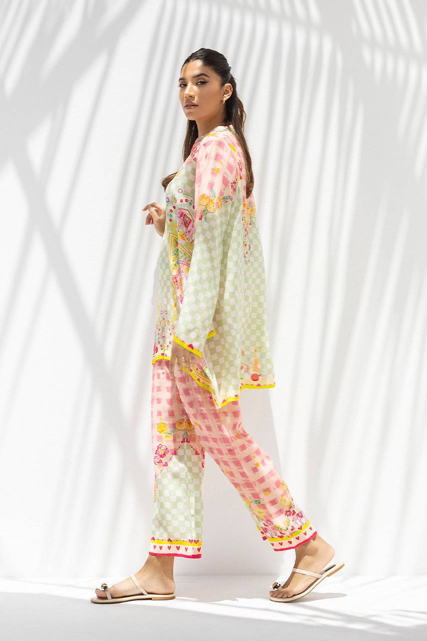 A crepe co-ord set exudes playful charm with its relaxed kurta, adorned in delicate pastel hues of tea green and blush chequered pattern, artfully accented by elephants, floral vines, fruits and vibrant hot pink hearts and pomegranates. Paired with perfectly tailored culottes featuring a whimsical chequered print.