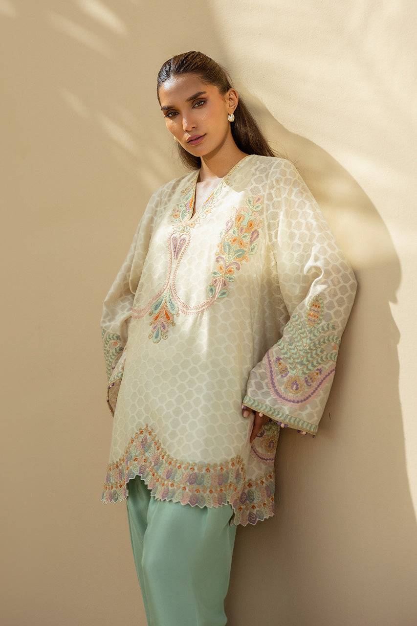 Softly sculpted in self embossed ivory khaddi corduroy, this ensemble features sorbet hued aari embroidery and delicate zari accents, making it an artisanal masterpiece. The hem and sleeves are finished with scalloped embroidery that echoes the tonal subtlety of the piece. It is paired with a fluid pure rawsilk shalwar in a seafoam tone, detailed with embellishment along the hem.