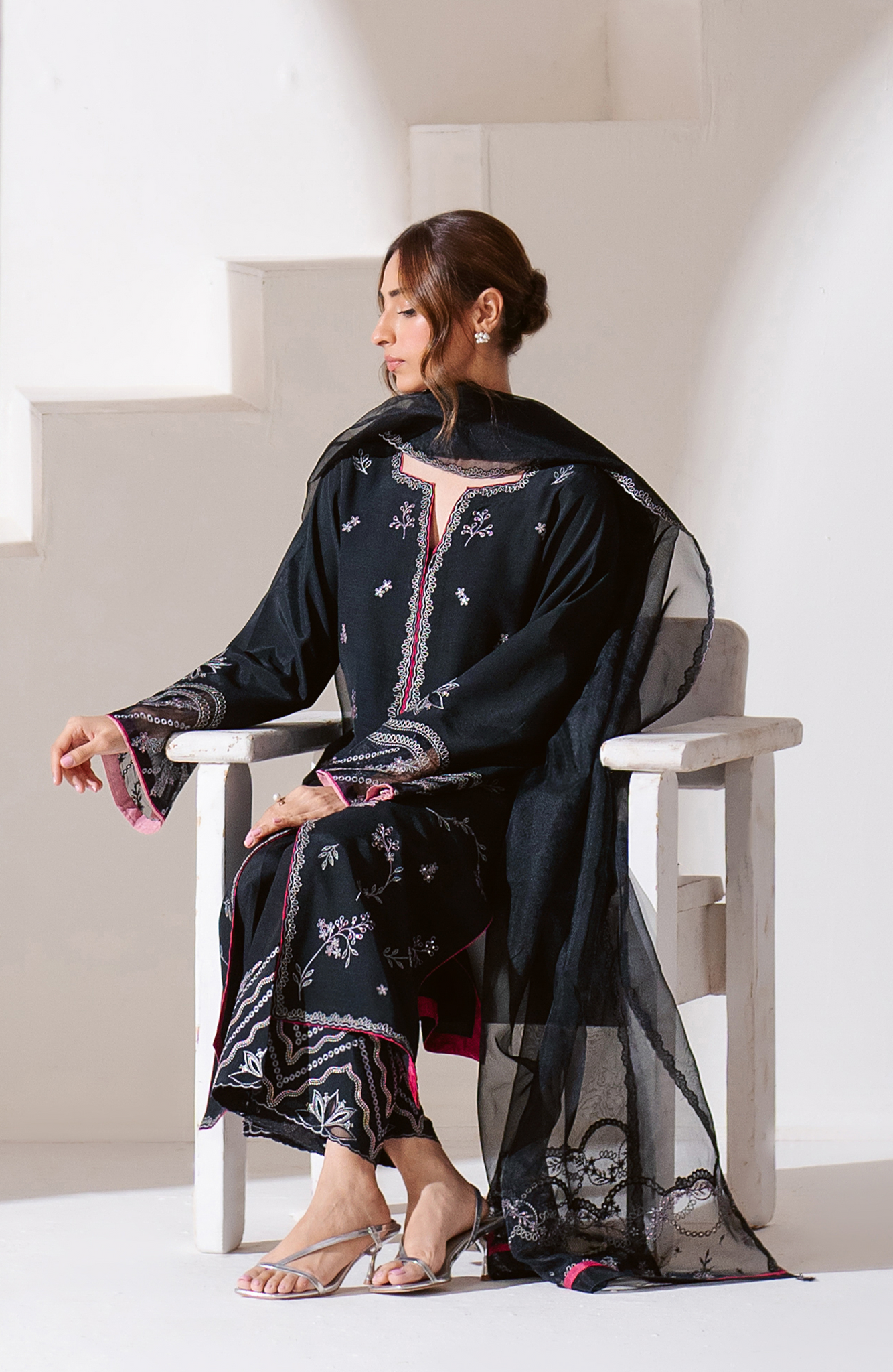 Elevate your style with this three-piece ensemble featuring a long open-front shirt adorned with delicate floral thread embroidery and contrasting piping. Applique detailing on the trouser and embroidered sleeve motifs add charm, while the dupatta with intricate pallus embroidery completes the look. Perfect for elegant occasions.