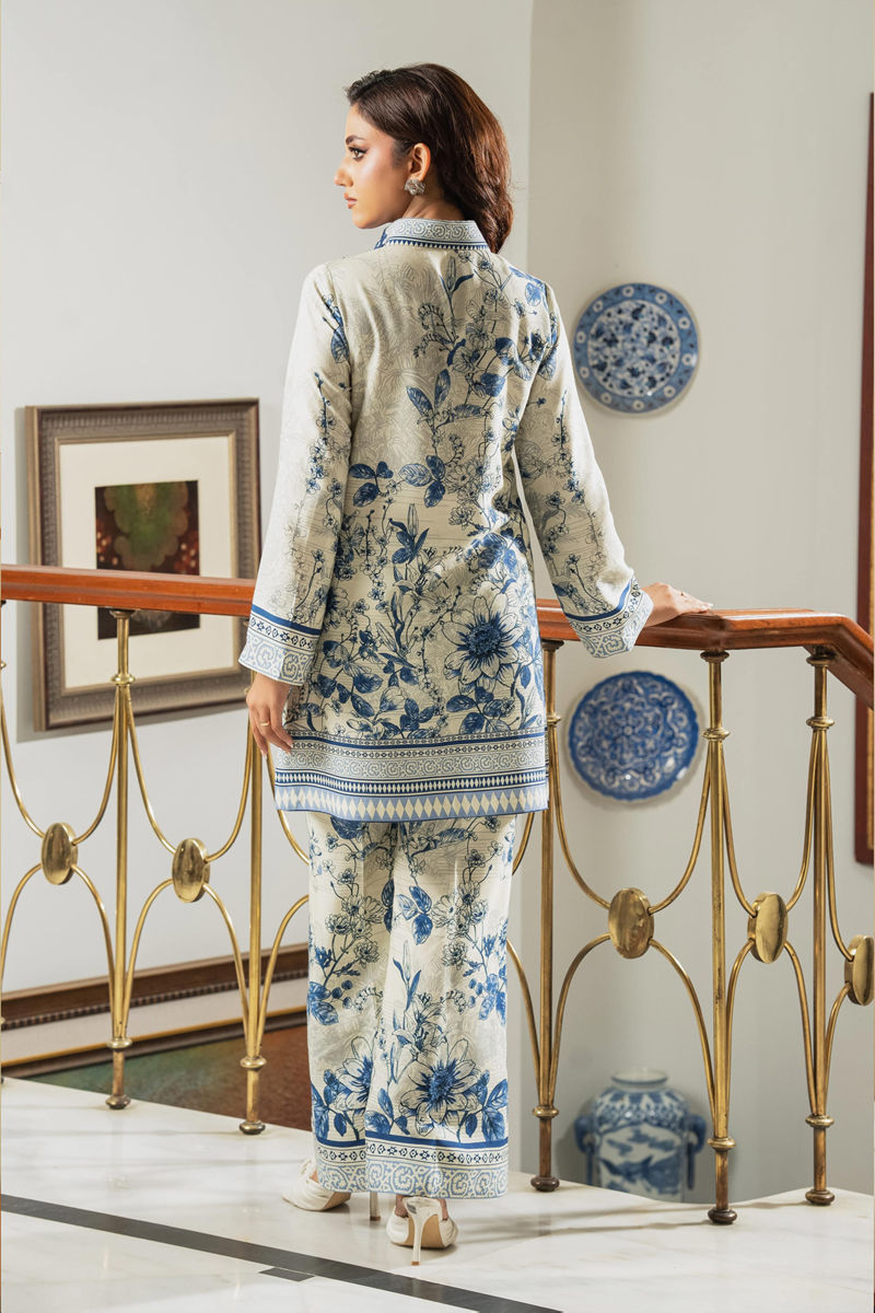 This Shamaeel Ansari outfit exudes timeless elegance with its ivory base, bold blue floral prints, and delicate embroidered motifs on the collar and side of neckline. Featuring a straight-cut shirt and matching trousers adorned with classic Mughal-inspired borders, it offers a perfect blend of tradition and sophistication. Crafted in a soft, breathable fabric, for all-day wear, perfect for Eid, casual outings, daytime events.
