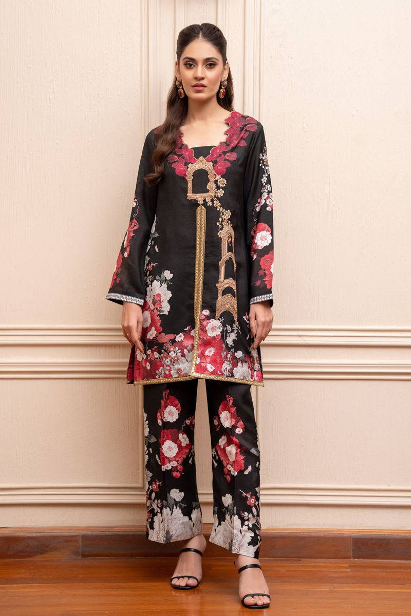 Elevate your style with our stunning black shirt, featuring intricate embroidery and a delicate scalloped outline on the neckline. Paired with a matching printed straight pant, this ensemble exudes effortless elegance and sophistication. Perfect for making a statement at any occasion!