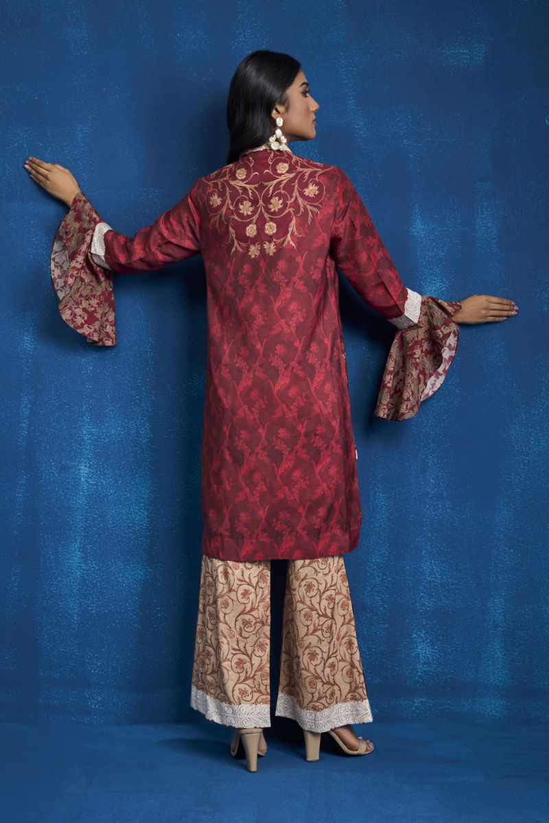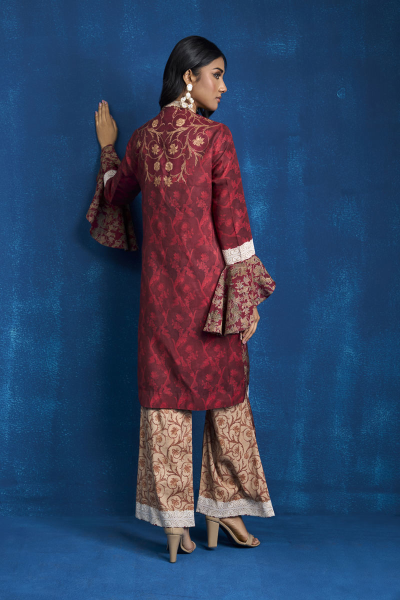 Elevate your ethnic wardrobe with this luxurious two-piece outfit made from Khaadi silk fabric. The ensemble features a printed shirt and stylish slit pants, inspired by the grandeur of Baroque ornaments, combining traditional elegance with a modern silhouette. The neckline is adorned with Tila embroidered floral motif, meticulously enhanced with Zardozi work appliqued on the neckline, adding a regal touch to the outfit.
