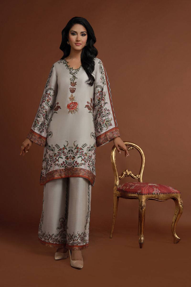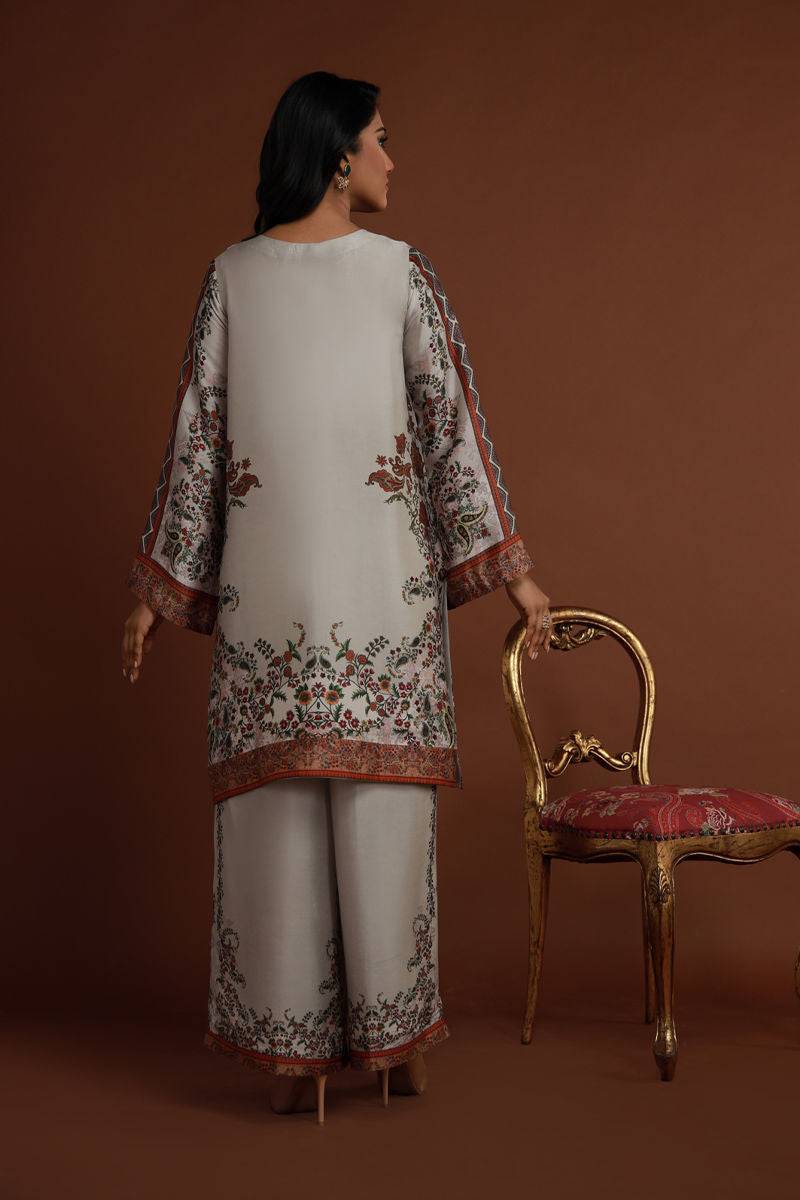 A serene dove grey coord set adorned with intricately placed floral and vine motifs in rich, earthy tones. At the heart of the neckline, print lies a striking red and gold embroidered rose motif, adding a regal touch to the delicate neckline. Ornate borders embellish the hem and sleeves, evoking timeless charm, while the wide-leg pants, finished with matching embroidery, lend cohesive elegance to the ensemble. Perfect for intimate soirees, cultural celebrations, or refined evening affairs.