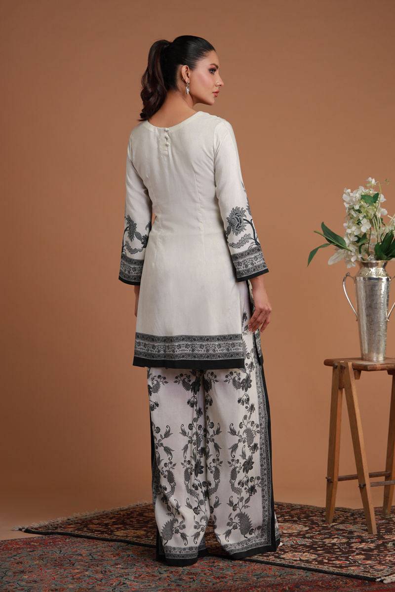 This white and black printed cord set is a bold fusion of modern style and traditional craftsmanship. The striking graphic print creates a dramatic visual impact, while machine embroidery adds a touch of luxury and texture. The intricate embroidery contrasts beautifully with the crisp monochrome design, enhancing its elegance. The streamlined silhouette makes it ideal for formal events, weddings, or special occasions. A complementing dupatta with subtle patterns and flowing edges completes the ensemble, adding grace and refinement. This chic set is a perfect balance of contemporary fashion and classic artistry.