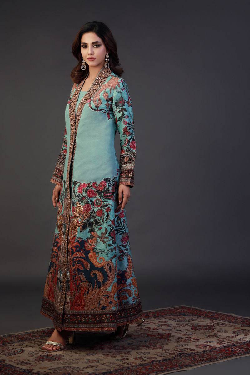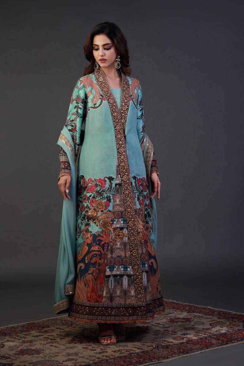 This exquisite aqua ensemble is a stunning fusion of traditional artistry and modern elegance. The front-open long jacket, in a mesmerizing aqua blue base, is adorned with intricate floral and Mughal-inspired prints in vibrant hues of red, gold, and deep blue. The rich embroidery, delicate sequin work, and ornate embellishments along the neckline and front panel add a regal touch.