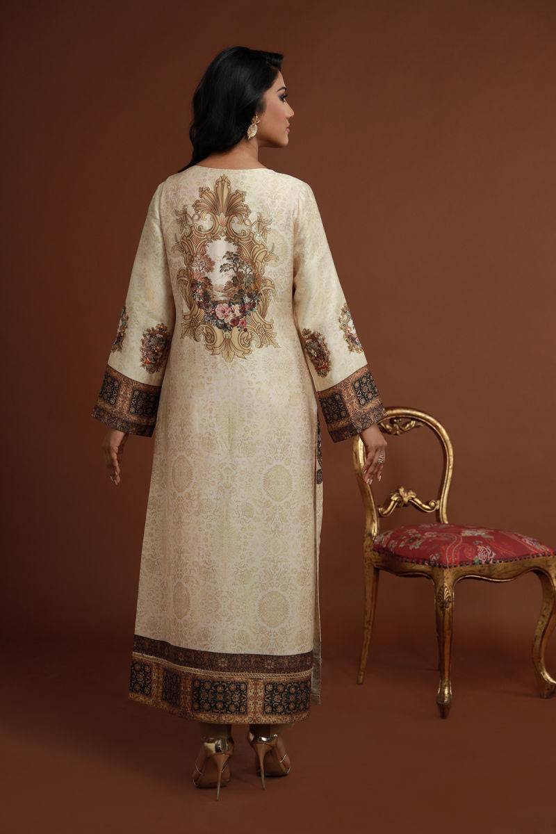 This signature Shamaeel straight-cut silhouette showcases a regal Baroque-inspired design on opulent sheesha silk. Intricately adorned with hand embroidery, elaborate embellishments, and antique gold outline, the ensemble radiates timeless grandeur. A printed, delicately embroidered belt cinches the waist, adding structure and completing the look with quintessential Shamaeel elegance, comes with pant. Perfect for intimate soirees, cultural celebrations, or refined evening affairs.