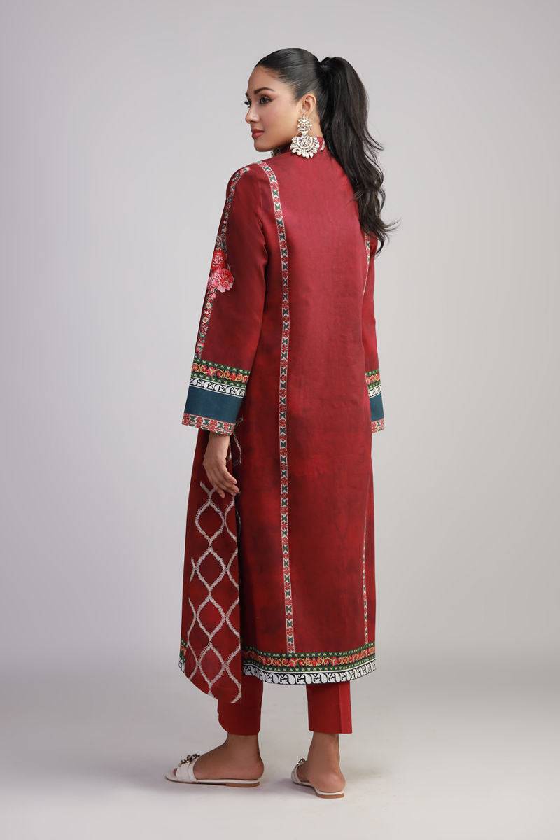A nod to classic elegance, this three-piece ensemble features an old-school style shirt layout paired with solid trousers for a timeless look. The contrast blue airy silk dupatta adds a touch of sophistication and grace, enhancing the overall elegance and class of the outfit.