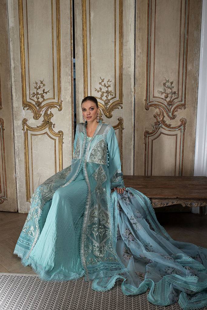 An exquisite sky blue outfit from Sobia Nazir’s Luxury Lawn 24 that radiates grace and refinement. The design features embroidered bodice lace with an organza bodice, enhanced with motif patches and detailed front organza panels. Sleeves are finished with organza patches and a hem border that elevates the silhouette. A printed organza dupatta adds sophistication, while plain dyed back, sleeves, and trousers balance the look with elegance.