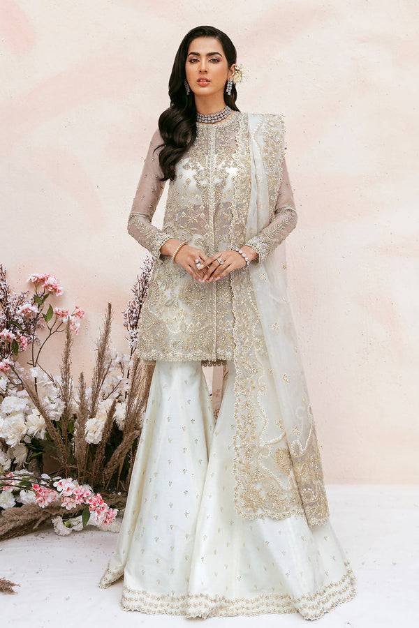 An enthralling pearl white organza jacket, meticulously crafted and adorned with hand-embroidered gold threads, embellished with precious gems, sequins, and gold zari. Dainty florals and ethnic motifs weave a dreamlike narrative throughout this regal ensemble. Paired with raw silk flared bell bottoms featuring delicate hand embroidery and an ethereal organza dupatta with exquisitely hand-embroidered borders and pallus, this outfit is the epitome of timeless elegance and opulent charm.