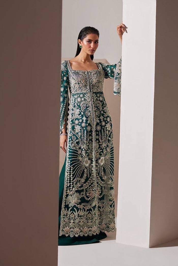 Luxe is a mesmerizing viridescent emerald organza flared gown, adorned with modern and rich silver dabka, intricate hand-beaded detailing, and elegant cape sleeves finished with hanging beads. The ensemble is paired with an organza dupatta, heavily embroidered along the borders, adding a regal touch. Sleek raw silk trousers perfectly complement the gown, creating a sophisticated and captivating ensemble ideal for grand occasions.