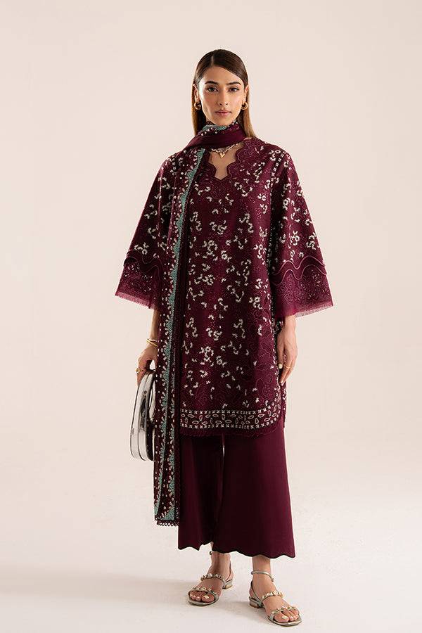 Wine jacquard short shirt featuring a scalloped V-neckline and all-over white petal embroidery. The hem and sleeves are finished with cutwork organza and fringes, creating a textured, dimensional look. Paired with wine cotton culottes featuring black wave-like finishing along the edges and sides, and a chiffon dupatta with sea-green borders, white embroidery, and lace elements for an elegant contrast, this set balances charm and sophistication for casual wear.