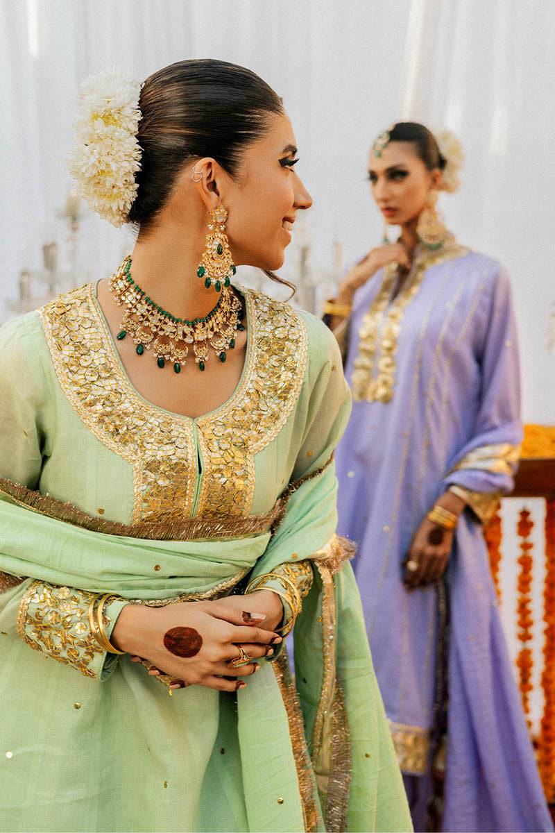 Heavily gota tikli embellished 4 kalli uma green kurta with kamdani chan all over paired with similar dhaka pajama and gota finished dupatta with chan.