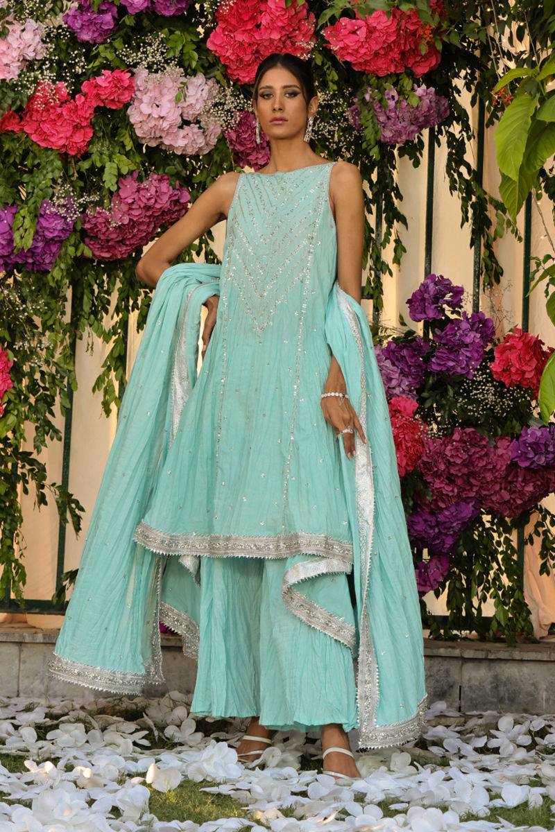 Pure muslin dolphin shirt embellished with sequence work finished with gota paired with same Color dhaka pajama and dupatta finished with gota.