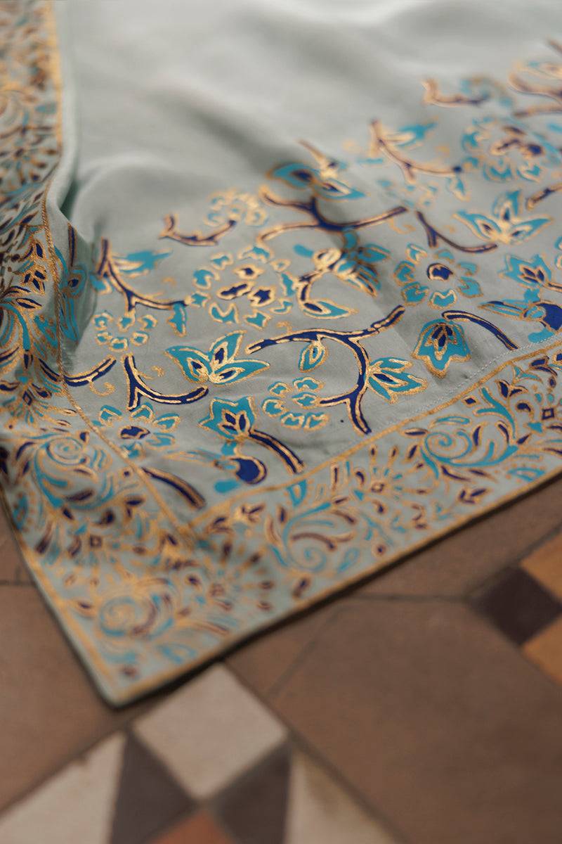 A graceful 3-piece pure silk outfit featuring a short, sleeveless straight shirt in a soft ice blue base, delicately block printed in silver and midnight blue for a refined, modern look. It is paired with a classic khari shalwar in matching ice blue, enhanced with subtle block print edging for added charm. The ensemble is completed with an ice blue dupatta, beautifully adorned with coordinating silver and midnight blue block prints, making it a perfect blend of elegance and contemporary flair.