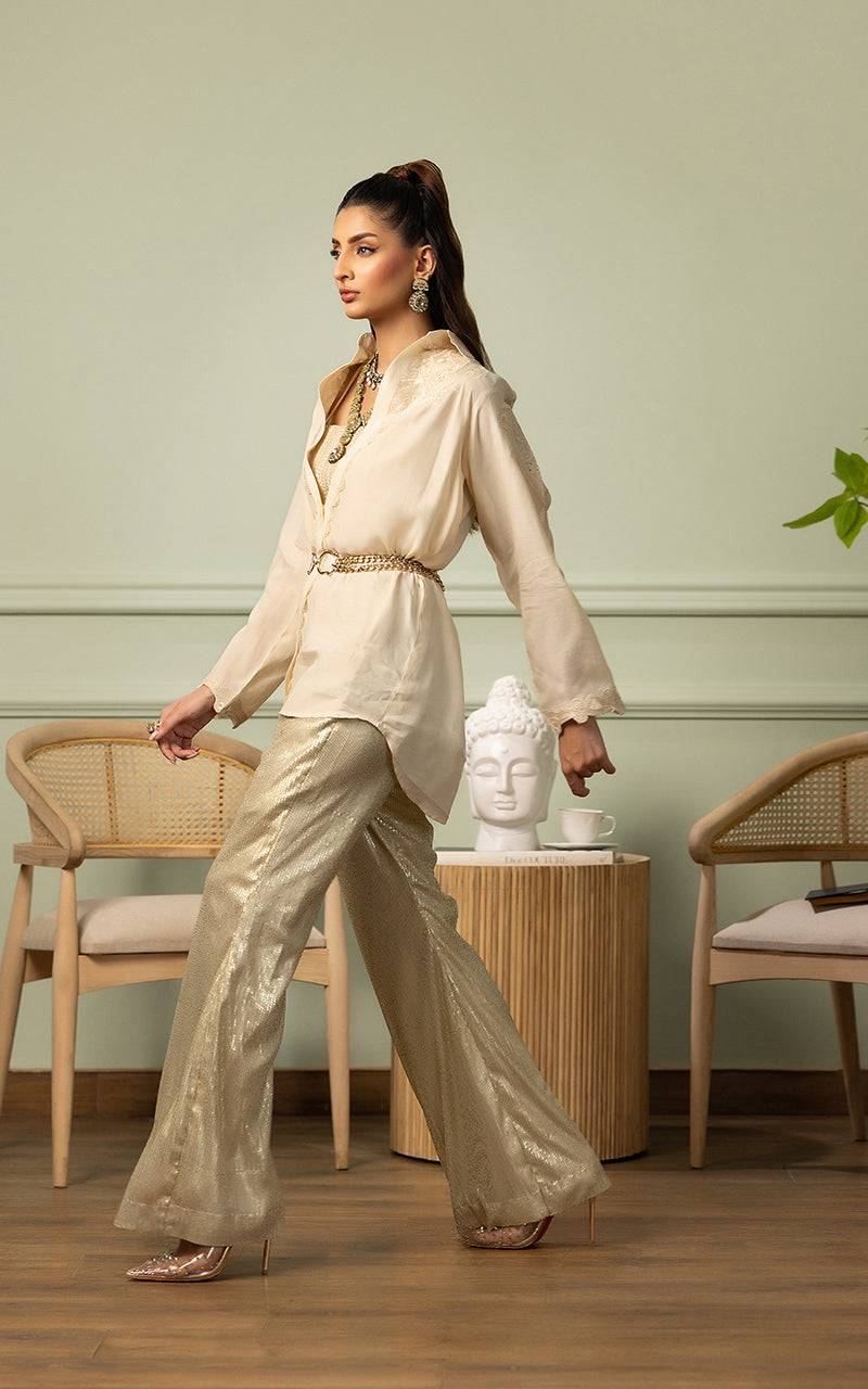The ultimate expression of luxury with our viscose silk shirt effortlessly combining modernity and contemporary chic style, the shirt's beautiful applique embroidery detailing, paired with the embroidered tube and dazzling sequins trousers, creates glamour and a high-fashion statement.