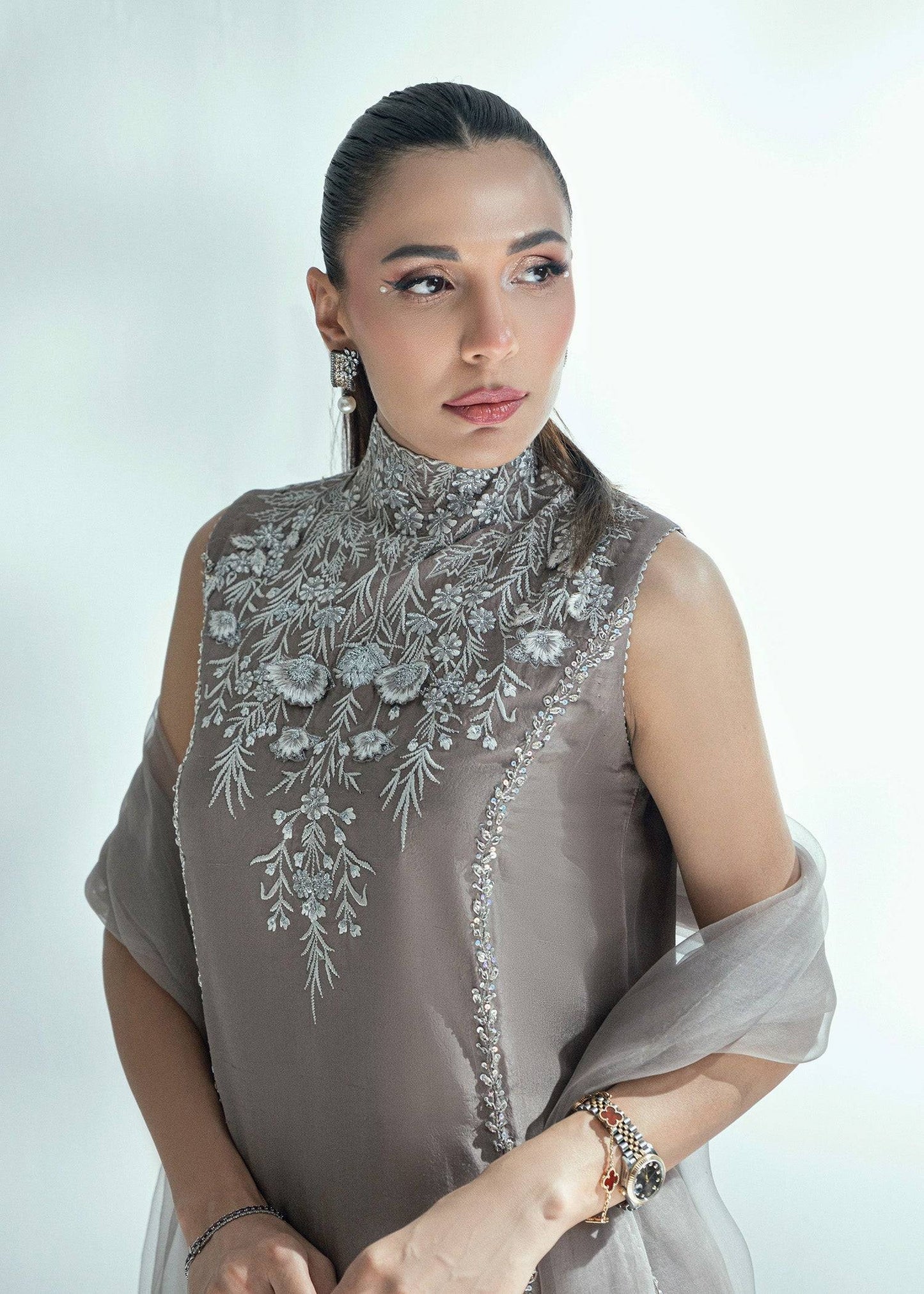 A graceful long shirt in a subtle mouse color, featuring a high neckline and elegant embroidery on both front and back with exquisite 3D flowers. The shirt showcases a beautifully embellished princess panel cut, adding a touch of regal charm. Paired with pure silk bottoms that enhance the outfit's refined appeal, and completed with a organza dupatta with delicate details.