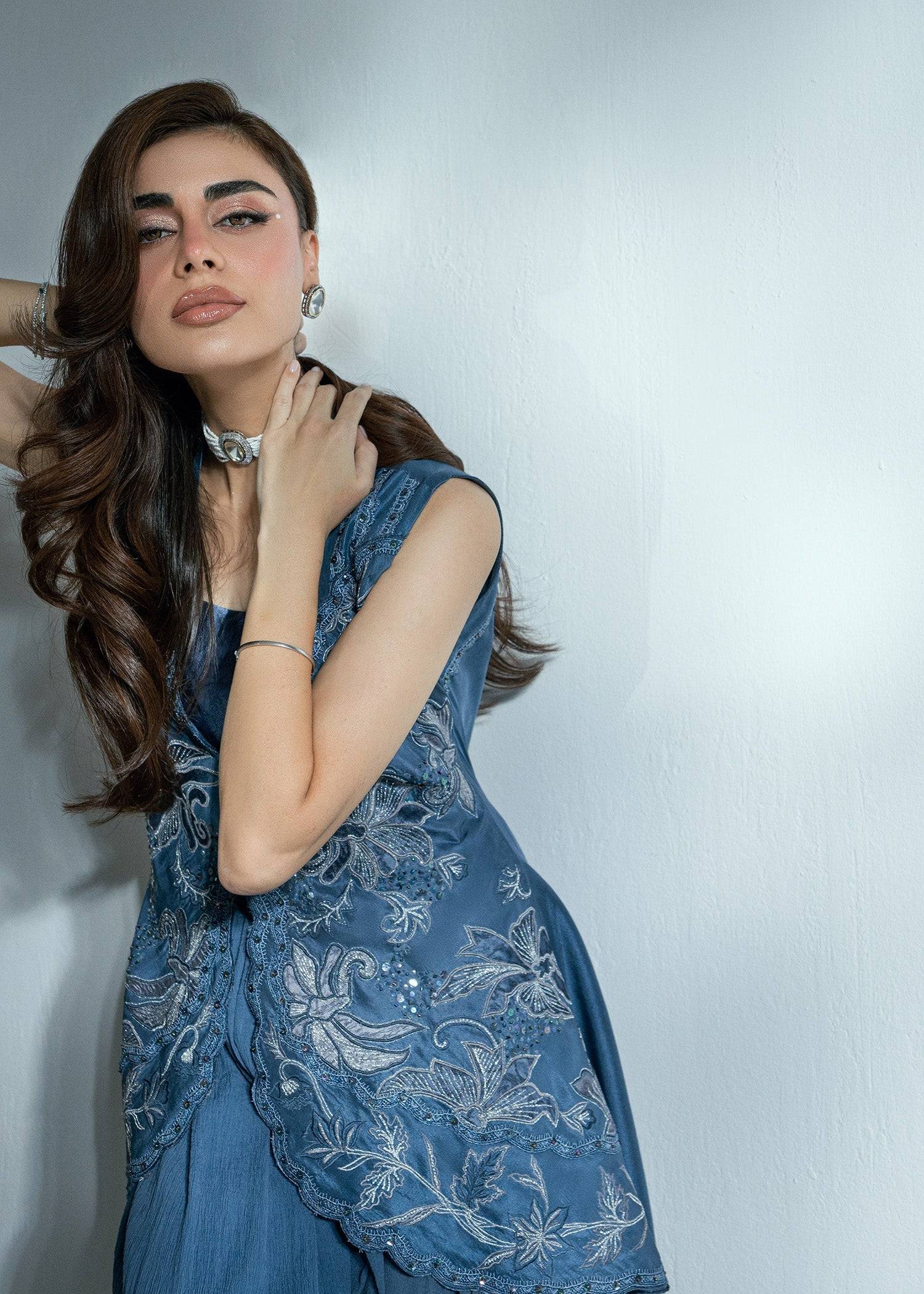 Blue embroidered jacket adorned with intricate applique detailing and delicate embellishments and handwork, exuding elegance. Paired with a chic pure silk bustier and pleated, flared pure chiffon palazzos for a graceful silhouette.