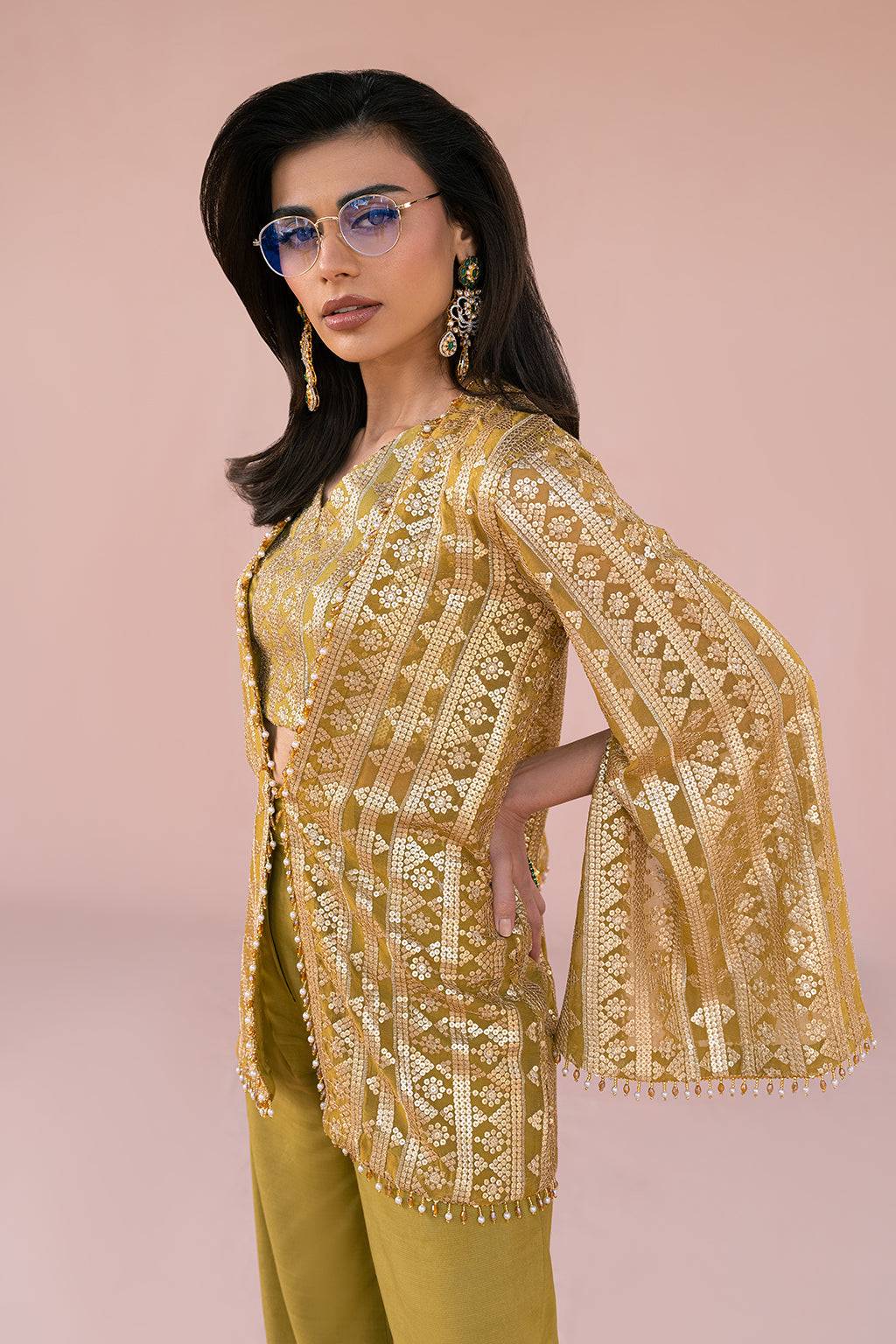 Sequinned tailored lime green front open jacket with wide legged pants and inner.