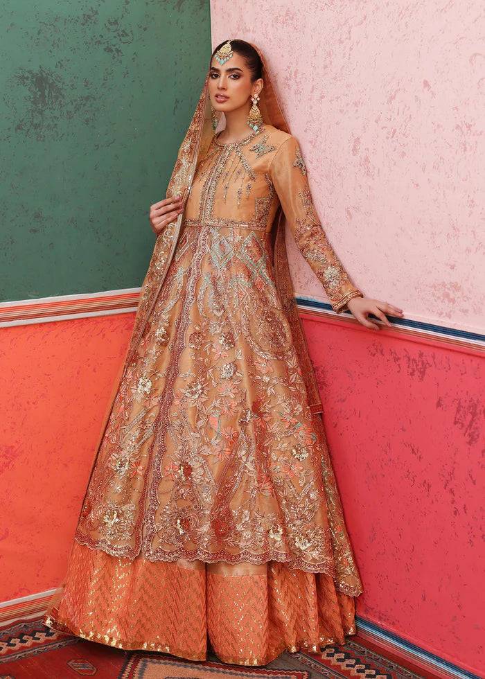 The bold and regal ensemble,Mehr e Ishq is a paneled front open net gown. It is paired with an tissue lehnga with sprawling hand crafted embellishments. An opulent statement design is paired with an acent color dupatta, the perfect hue of peach. Intricately embellished all around the border and glittering spray throughout.
