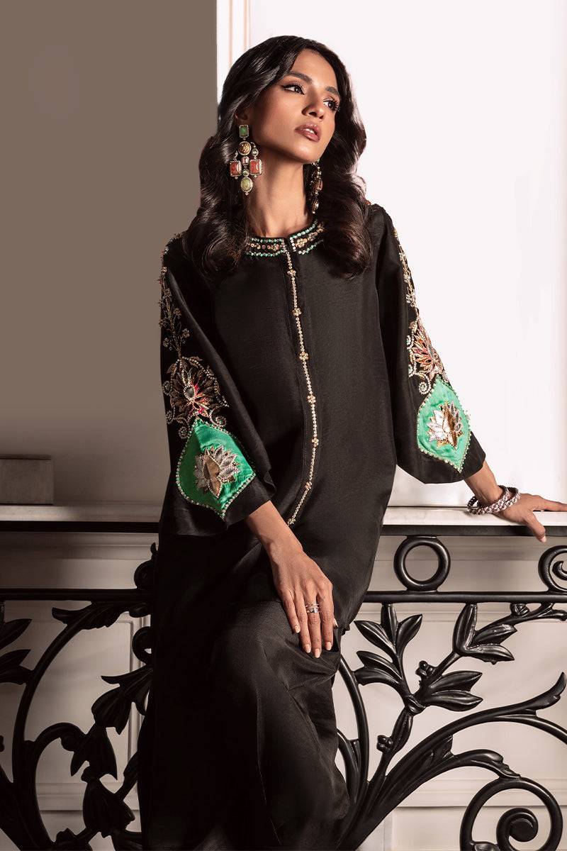 Black Formal Front Open Coord-Set Featuring our Signature Leather Applique Work with Intricate Resham, Zardoze, and Cutdana Hand Embroidery. Finished With Swarovski Crystals, Rhinestoens and Pearl Hand Embellishment and Detailing.Paired With Slim Fit Shalwar with Cuffs (Optional) To Complete The Look.