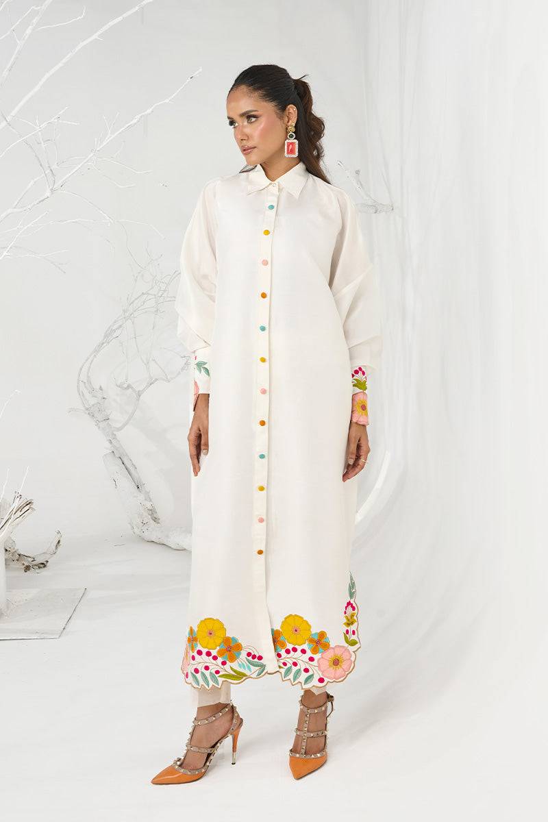 Make a statement with this Pure Raw-Silk ensemble. Our signature Box Cut Shirt featuring intricate Resham Threadwork, Cutwork Applique and muti-color hand-made buttons details.