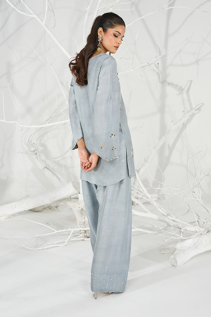 Ash Grey formal Shalwar Kameez featuring intricate motifs made with zardoze embroidery and crystal work. Comes with crystal embellished Farshi Shalwar.